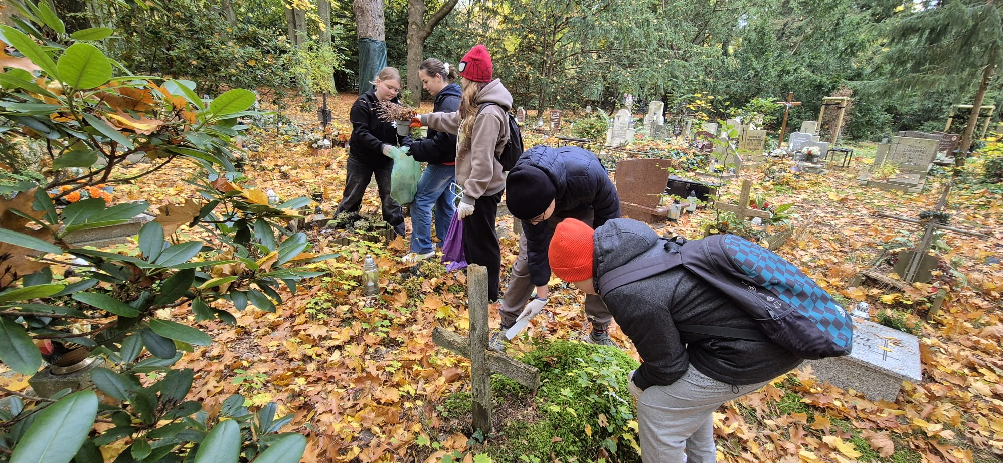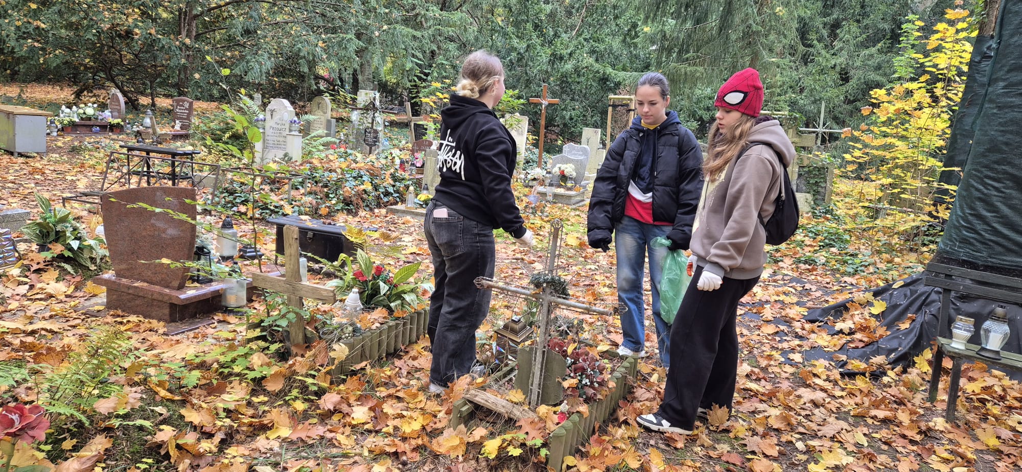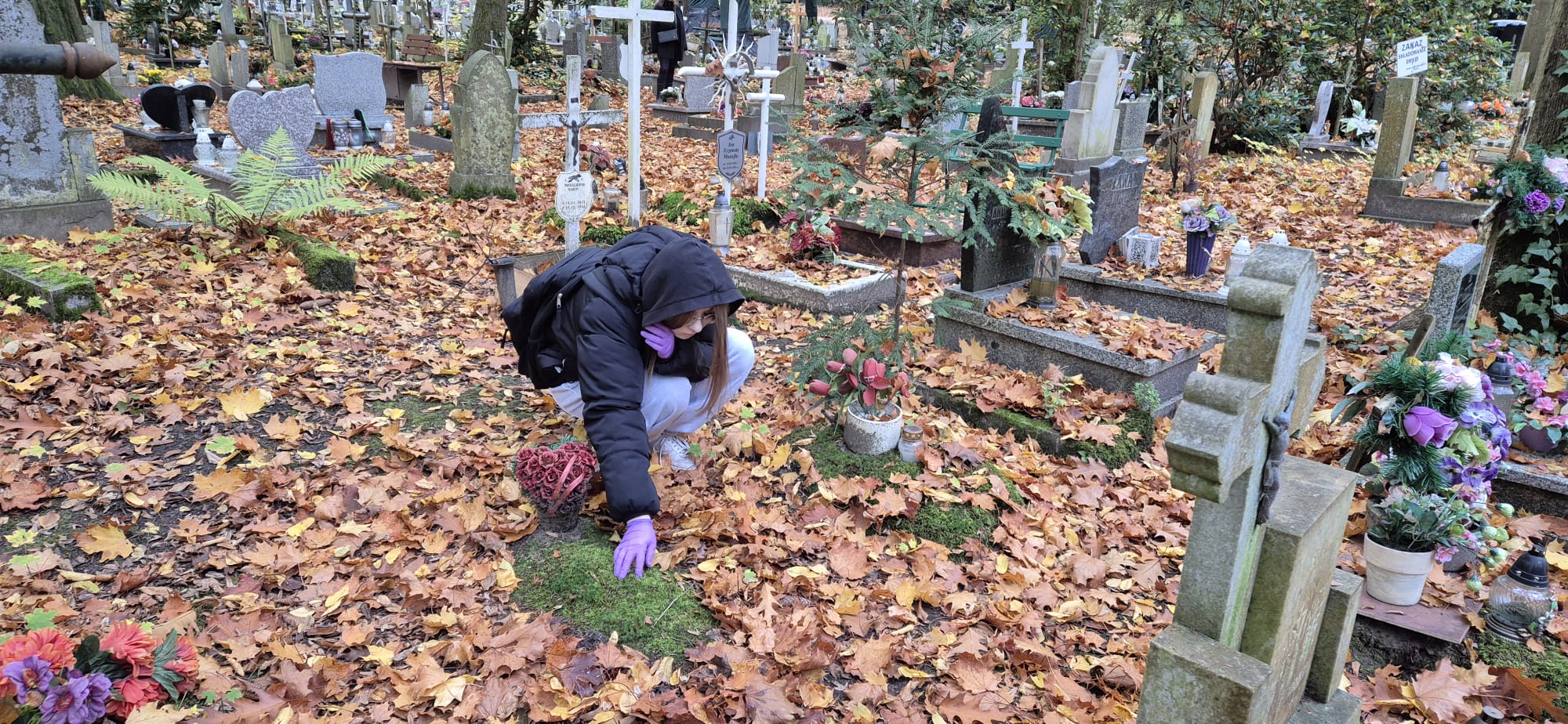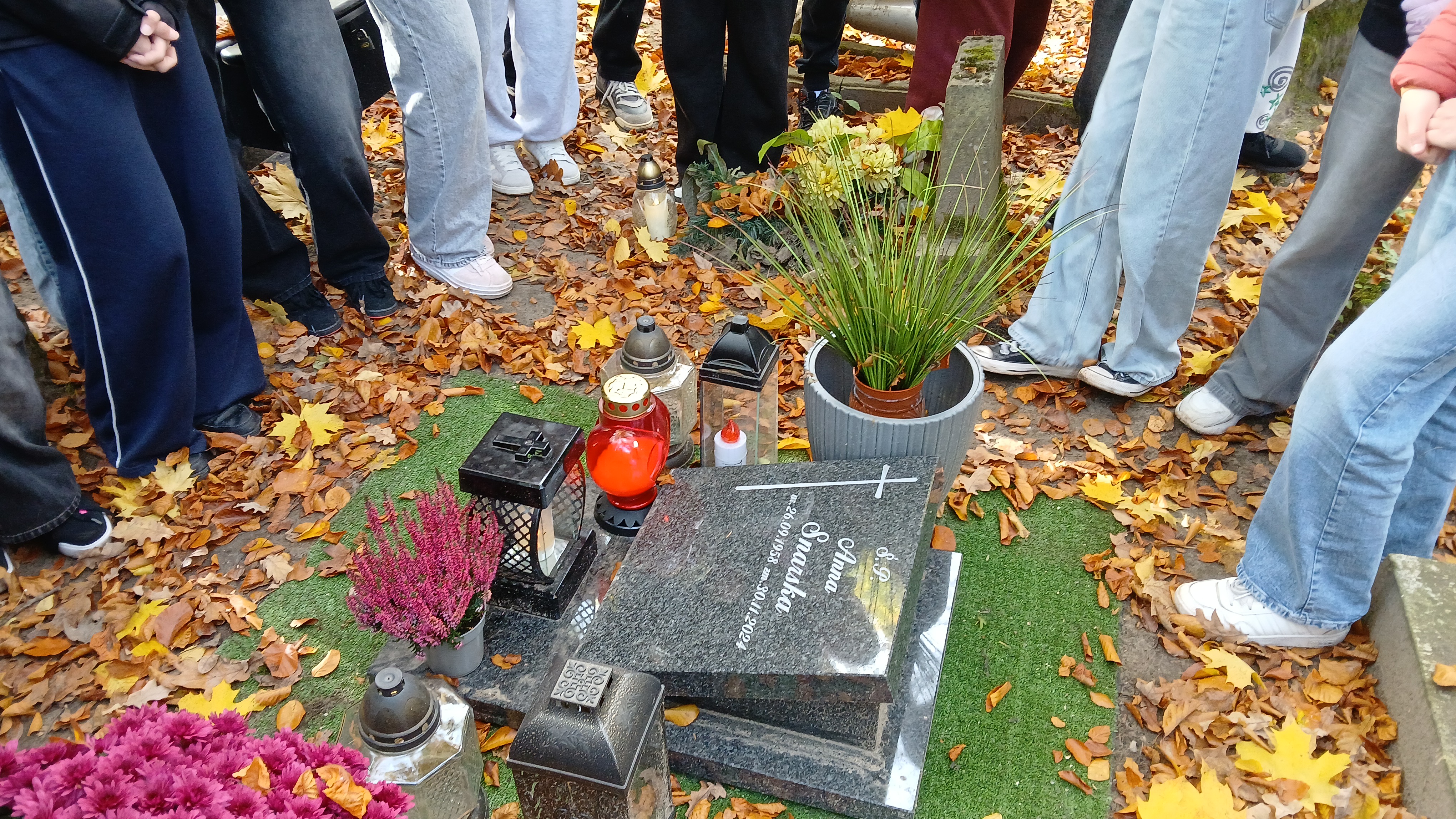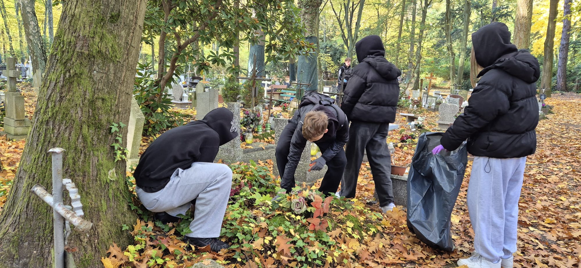 W dniu 25 października członkowie Szkolnego Koła Wolontariatu wzięli udział w akcji porządkowania grobów na Cmentarzu Centralnym. Czyściliśmy płyty nagrobne, usuwaliśmy zeschnięte liście, wyrzucaliśmy śmieci i zapalaliśmy znicze. Celem naszego wyjścia było okazanie szacunku zmarłym, których groby od dawna nie są odwiedzane, oraz kształtowanie wśród uczniów postaw empatii, troski i odpowiedzialności za wspólne dziedzictwo. Po zakończeniu akcji odwiedziliśmy grób śp. pani Anny Snarskiej wieloletniej wicedyrektor naszej szkoły. Wspólnie wspominaliśmy Jej zaangażowanie w życie szkolnej społeczności, zapaliliśmy znicz i oddaliśmy Jej hołd chwilą ciszy.