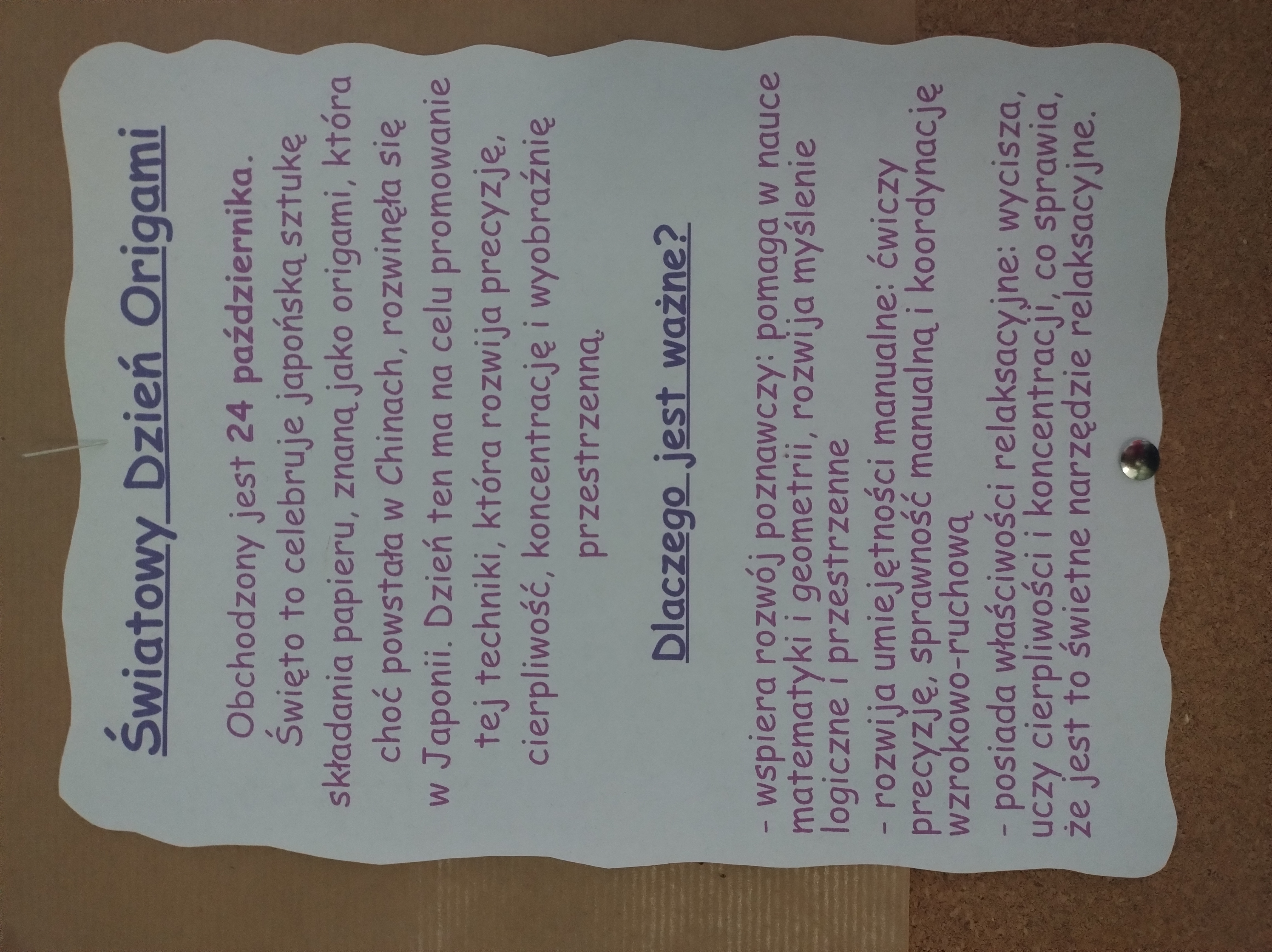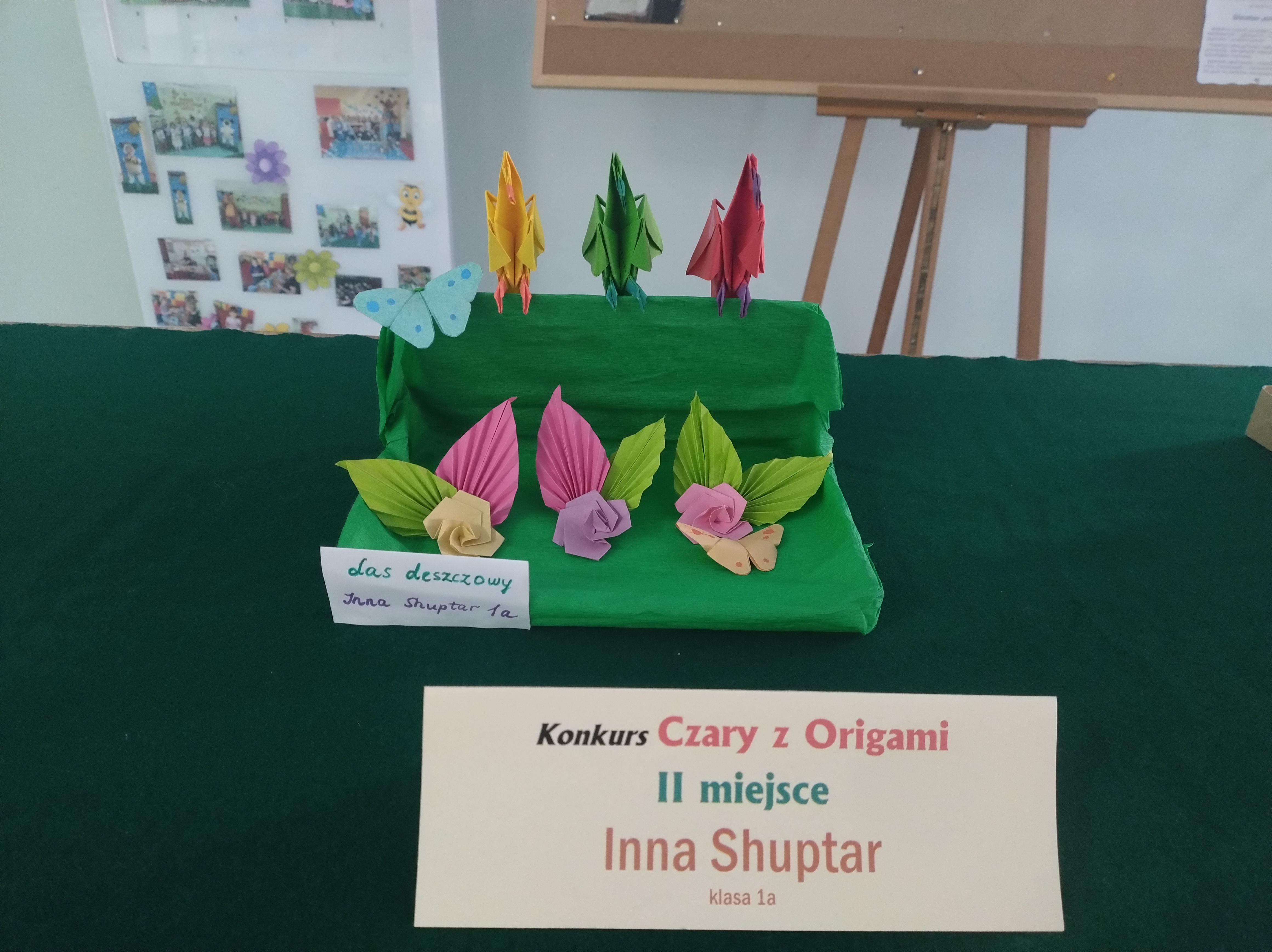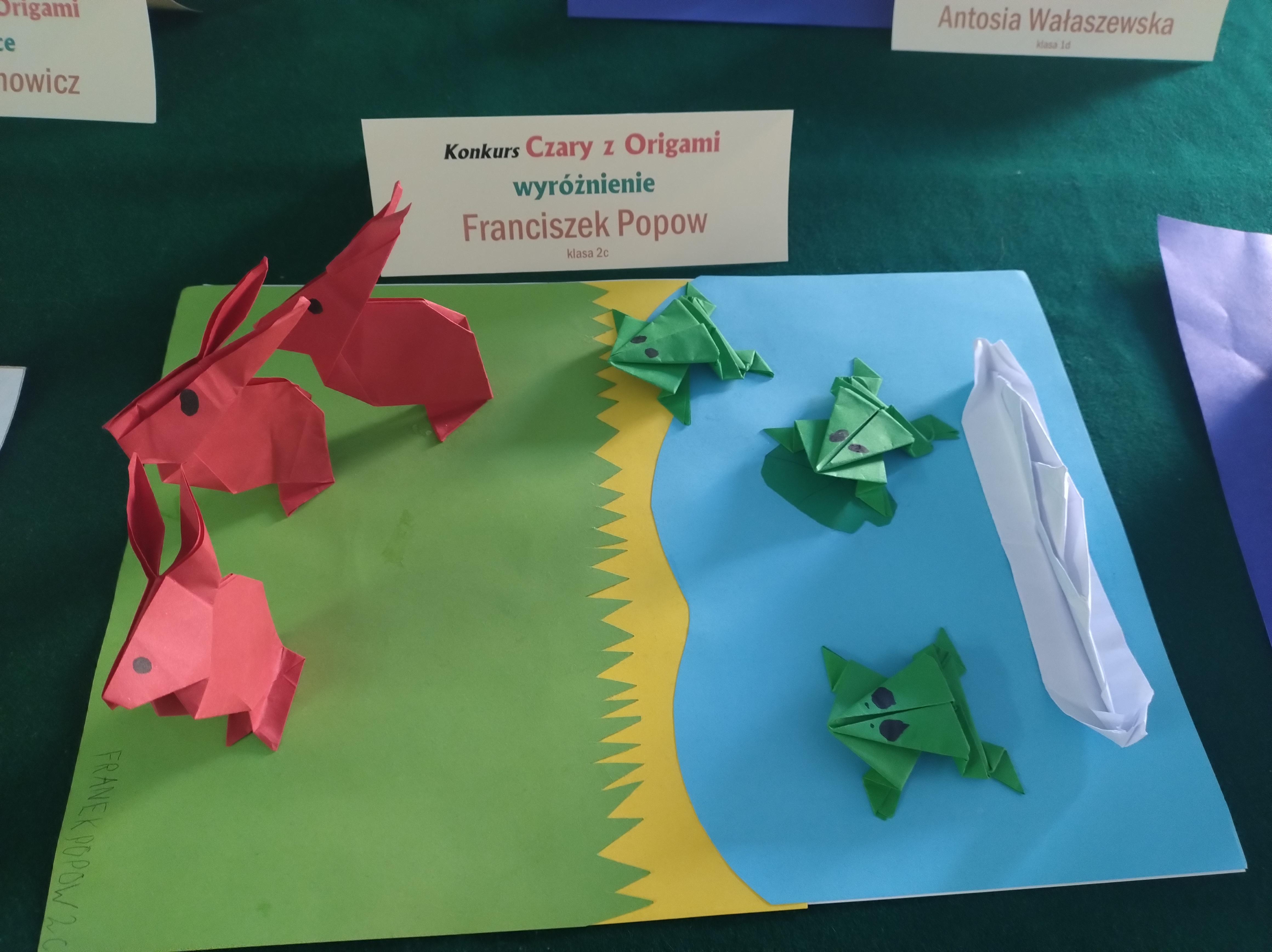 W związku z obchodami Światowego Dnia Origami, w naszej szkole został zorganizowany konkurs "Czary z Origami" dla klas 1-3. Uczniowie podjęli wyzwanie zmierzenia się z wykonaniem prac trudną sztuką składania papieru. Rozwijając wyobraźnię, ćwicząc cierpliwość, dokładność i precyzję stworzyli piękne prace, a komisja konkursowa w składzie p. wicedyr. Iwona Kozak, p. wicedyr. K. Cierkowska - Gendek i p. W. Lewandowska miała trudne zadanie wyłonienia zwycięzców.