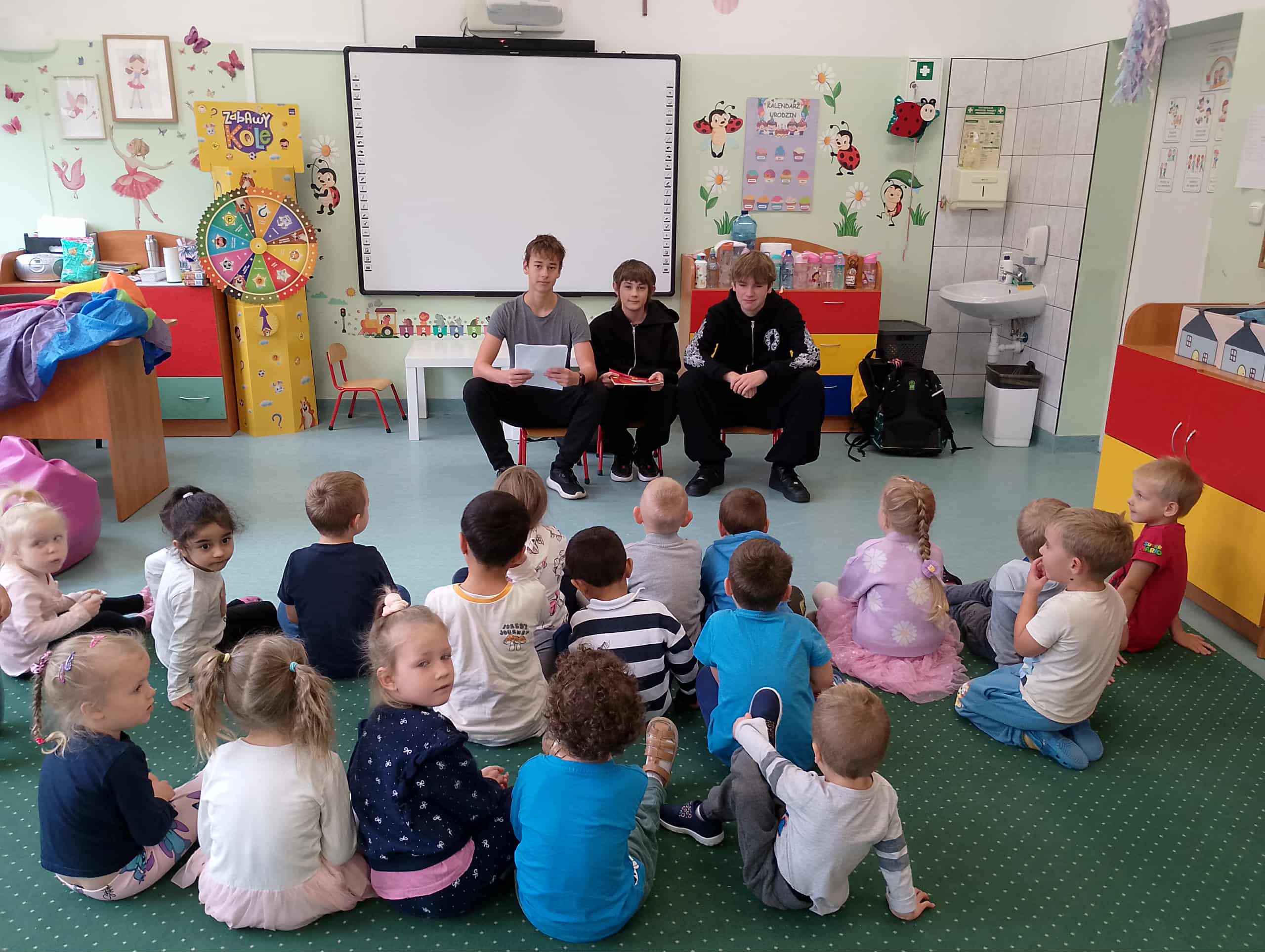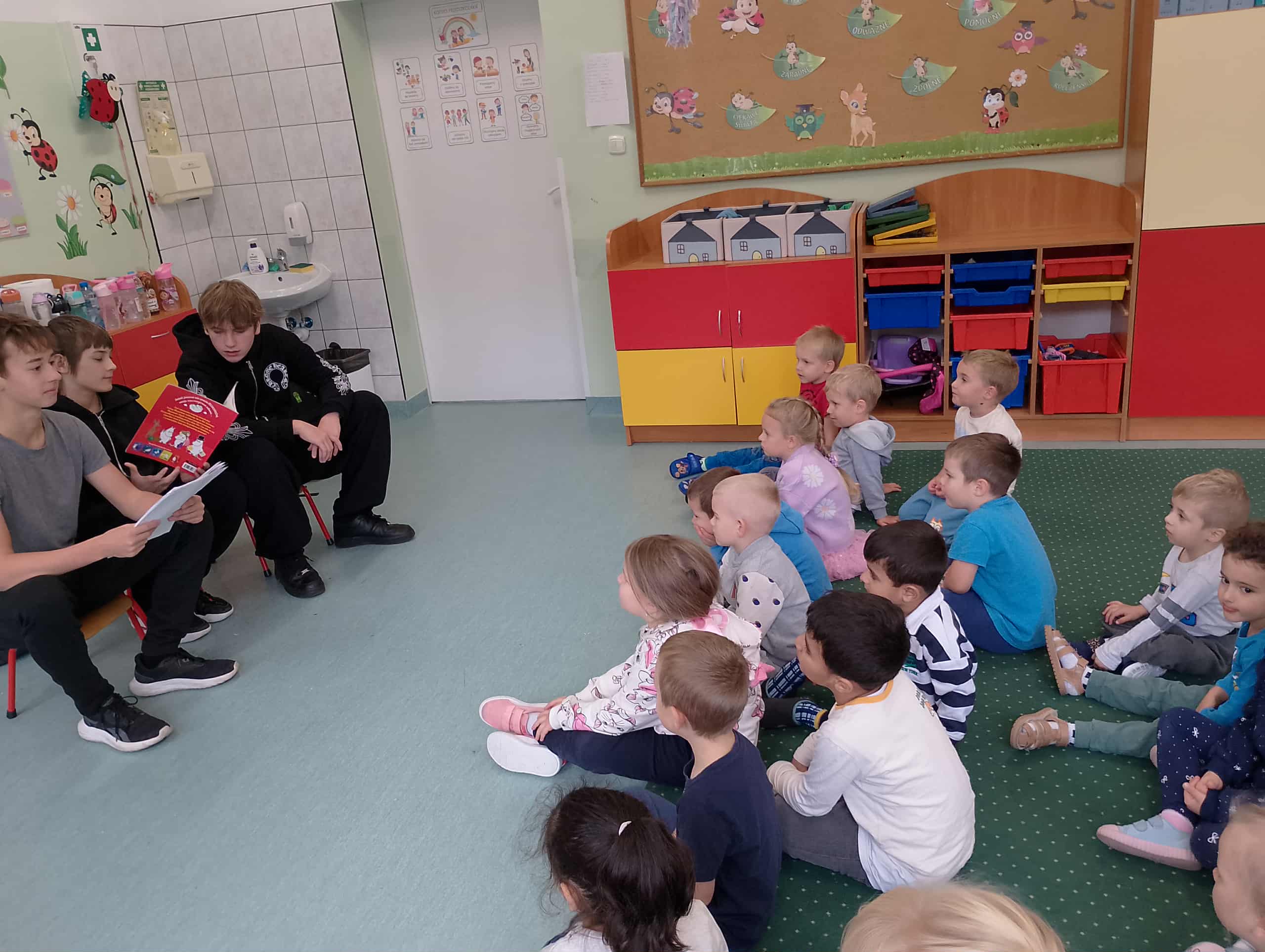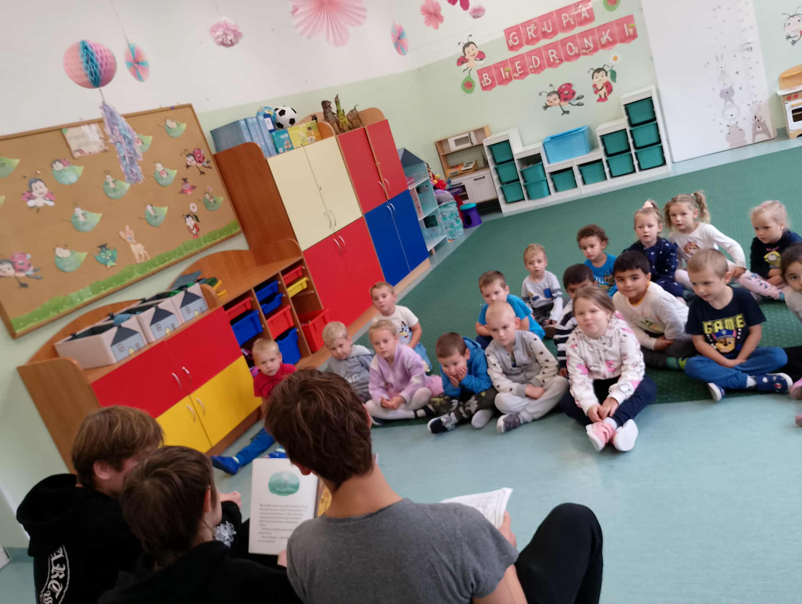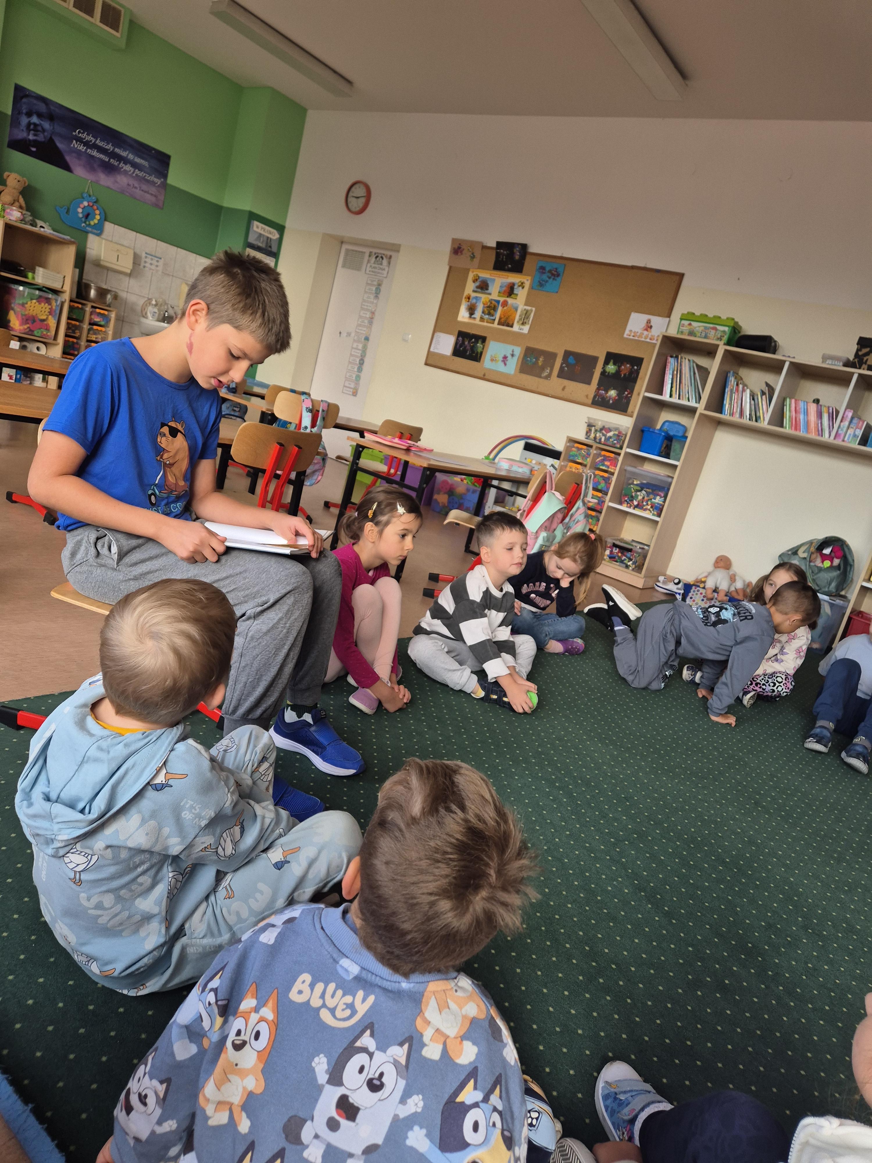 30 września obchodziliśmy Ogólnopolski Dzień Głośnego czytania. Przedszkolaki z tej okazji, miały wyjątkowych gości. Uczniów klas starszych naszej szkoły. Grupę 0a odwiedził Szymon Bielski, uczeń klasy 3A, który przeczytał kolejne przygody Duszka Bogusia, natomiast nasze najmłodsze biedroneczki odwiedzili uczniowie z klasy 8b Karol Cz. Piotr J. oraz Leon, którzy przeczytali Muminki.