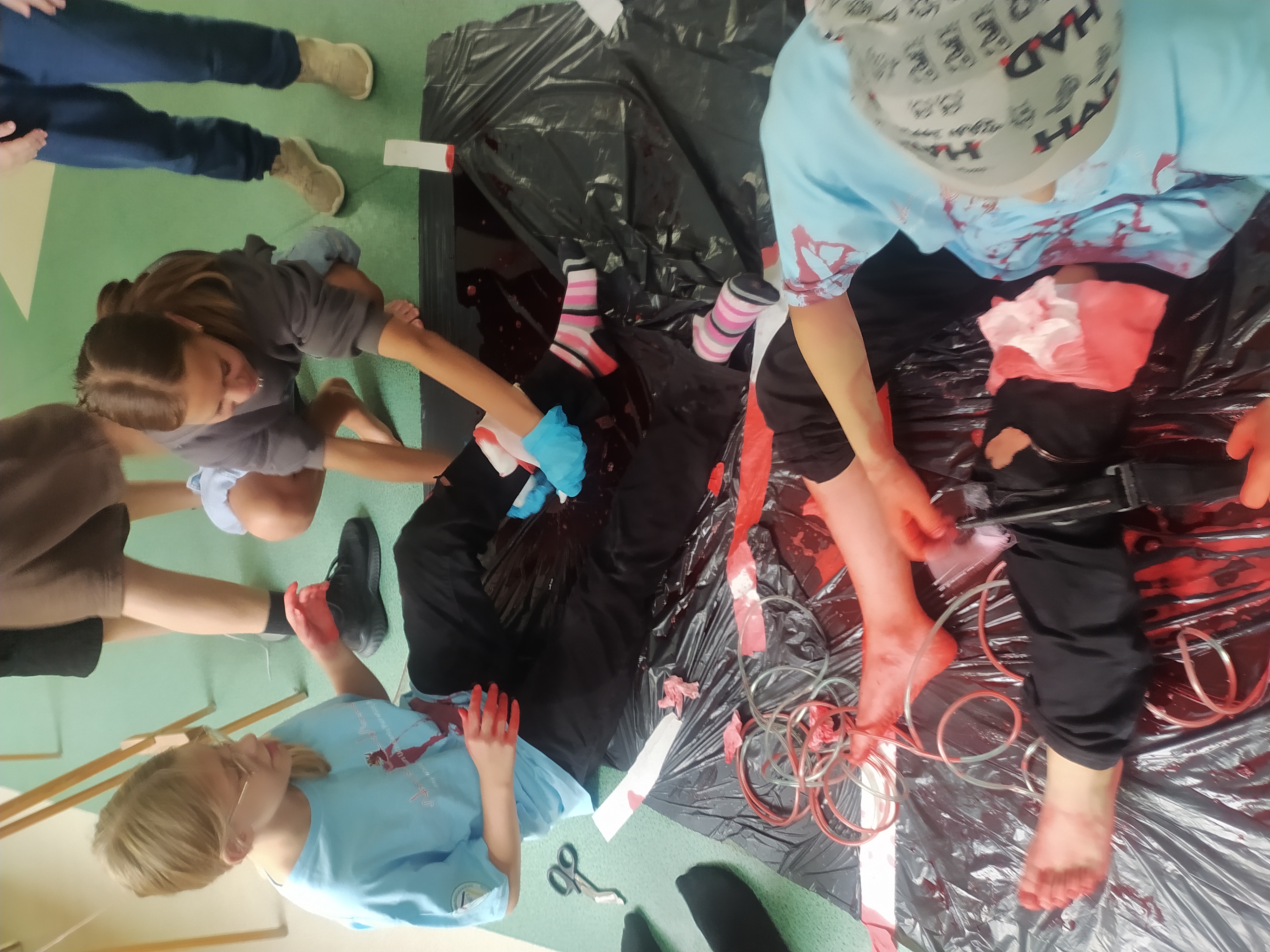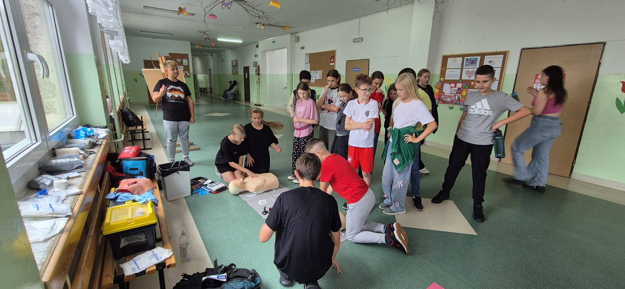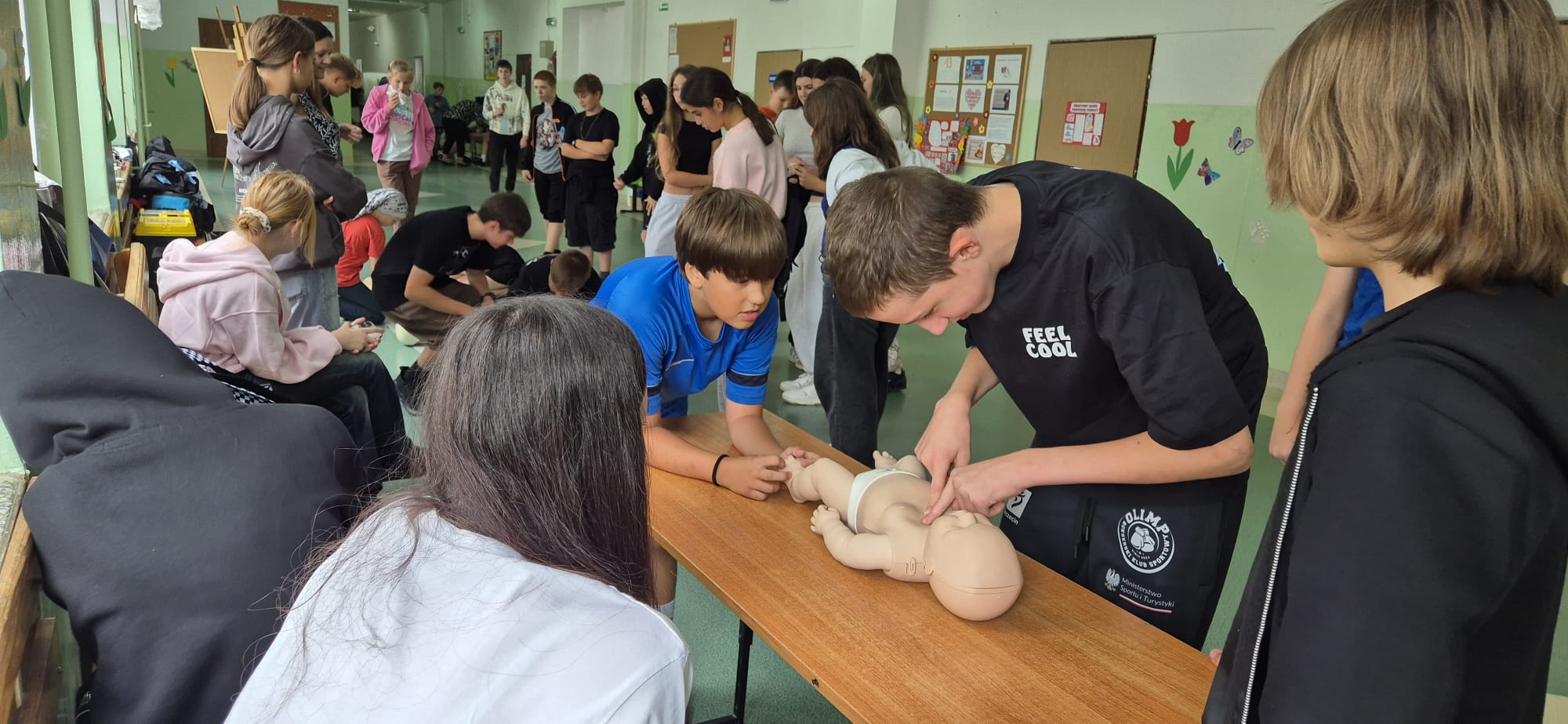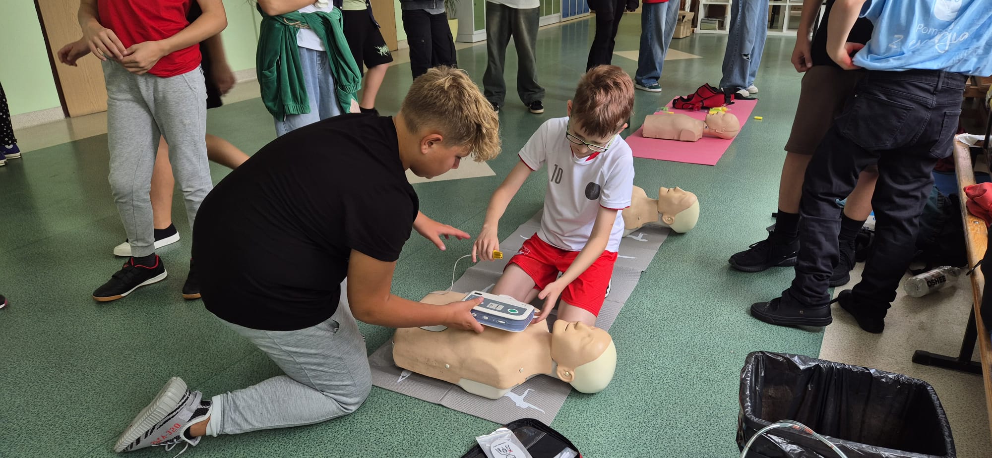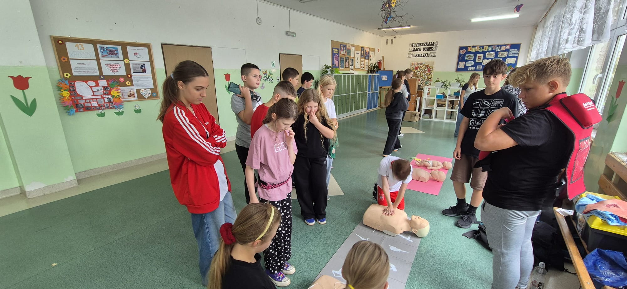 12 września kilkoro uczniów z klas 6b, 7a i 8a chętnie dzieliło się swoją wiedzą i umiejętnościami, za co im serdecznie dziękujemy. Dużym zainteresowaniem cieszyła się między innymi kamizelka do ćwiczeń uciśnięć nadbrzusza przy zadławieniach oraz fantom niemowlaka. Można było również zobaczyć jak obsługiwać defibrylator, a na przerwie o godzinie 13.25 dwoje uczniów odegrało rolę poszkodowanych. Ich „rany” wyglądały poważnie, ale na szczęście w naszej szkole zawsze znajdą się osoby gotowe, by nieść pomoc poszkodowanym. Z zasadami udzielania pierwszej pomocy zapoznali się też uczniowie uczestniczący w zajęciach edukacji zdrowotnej. Mamy nadzieję, że akcja, w której uczestniczyliście wzmocniła w was jeszcze bardziej świadomość potrzeby udzielania pierwszej pomocy.