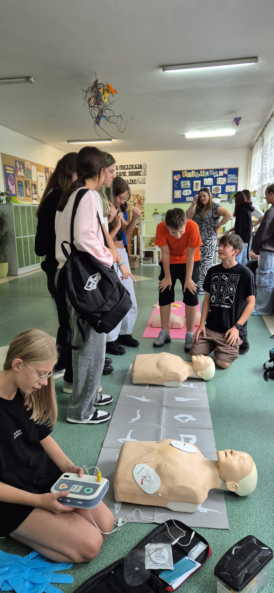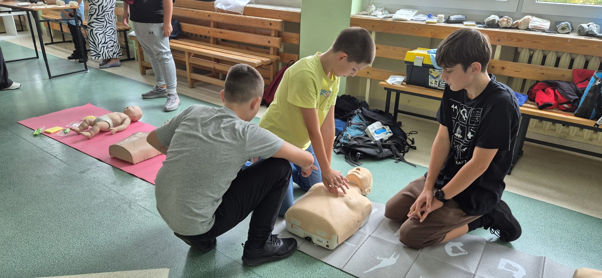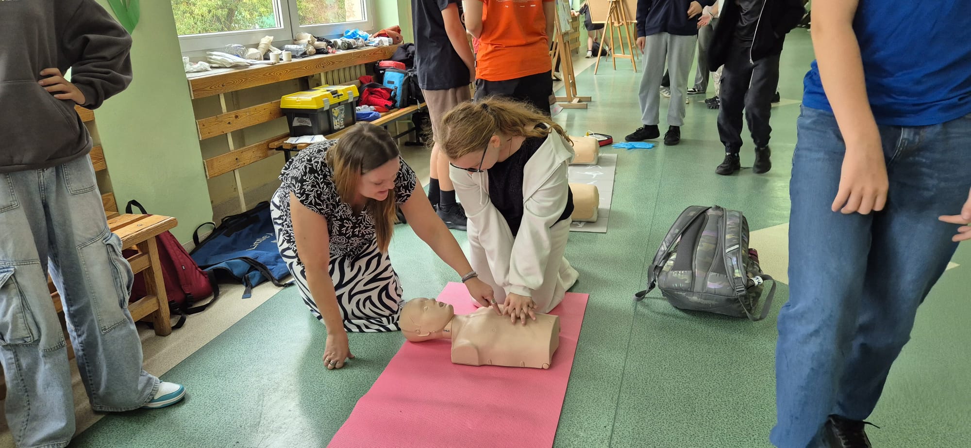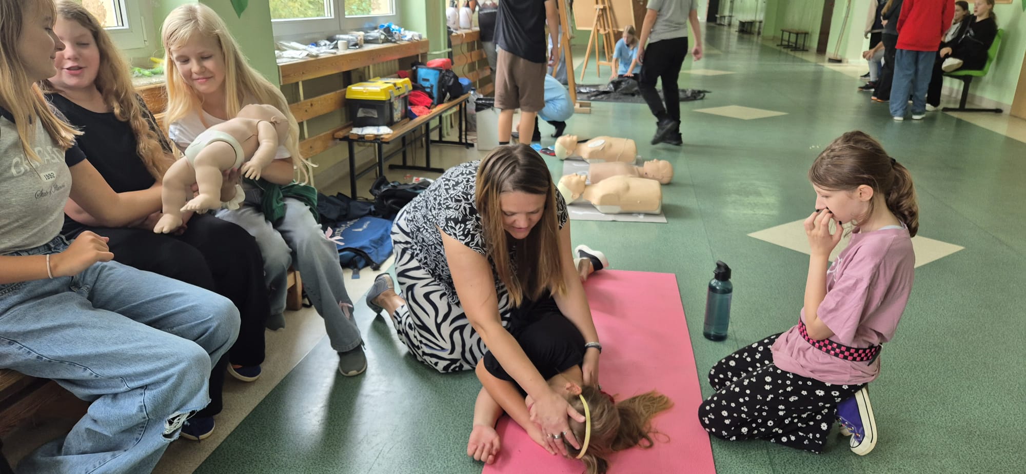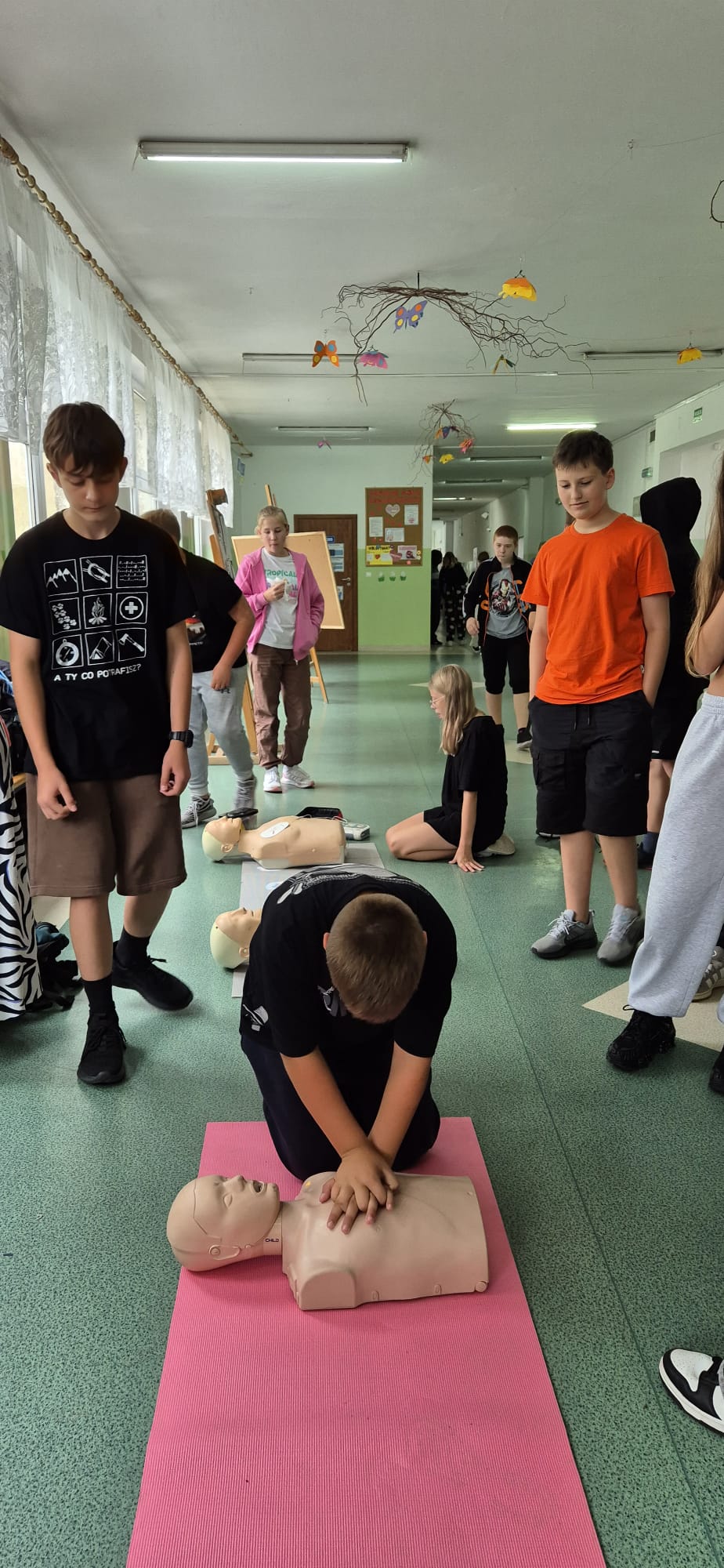 12 września kilkoro uczniów z klas 6b, 7a i 8a chętnie dzieliło się swoją wiedzą i umiejętnościami, za co im serdecznie dziękujemy. Dużym zainteresowaniem cieszyła się między innymi kamizelka do ćwiczeń uciśnięć nadbrzusza przy zadławieniach oraz fantom niemowlaka. Można było również zobaczyć jak obsługiwać defibrylator, a na przerwie o godzinie 13.25 dwoje uczniów odegrało rolę poszkodowanych. Ich „rany” wyglądały poważnie, ale na szczęście w naszej szkole zawsze znajdą się osoby gotowe, by nieść pomoc poszkodowanym. Z zasadami udzielania pierwszej pomocy zapoznali się też uczniowie uczestniczący w zajęciach edukacji zdrowotnej. Mamy nadzieję, że akcja, w której uczestniczyliście wzmocniła w was jeszcze bardziej świadomość potrzeby udzielania pierwszej pomocy.