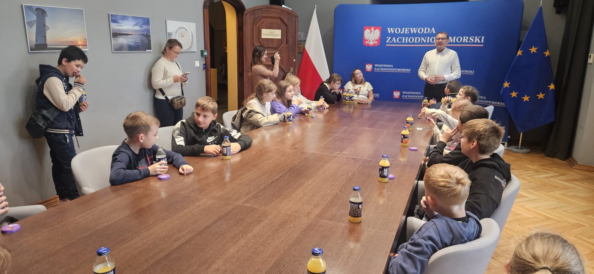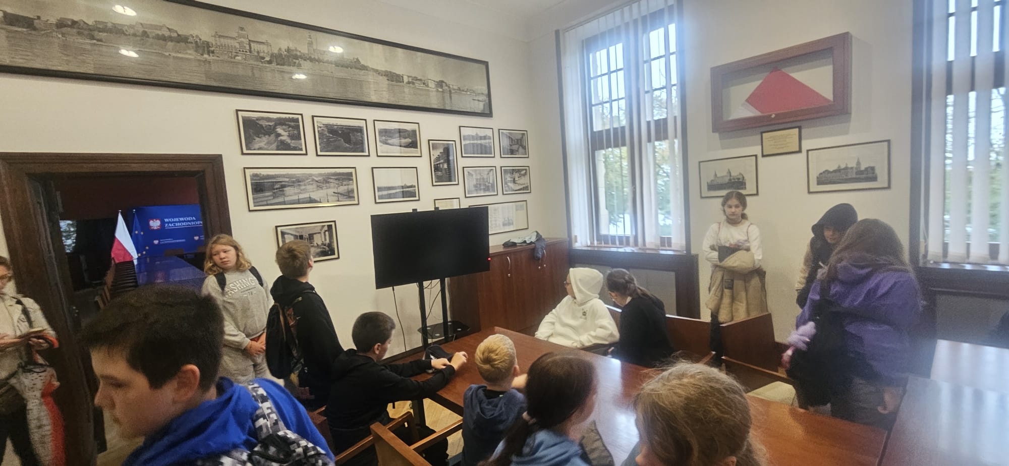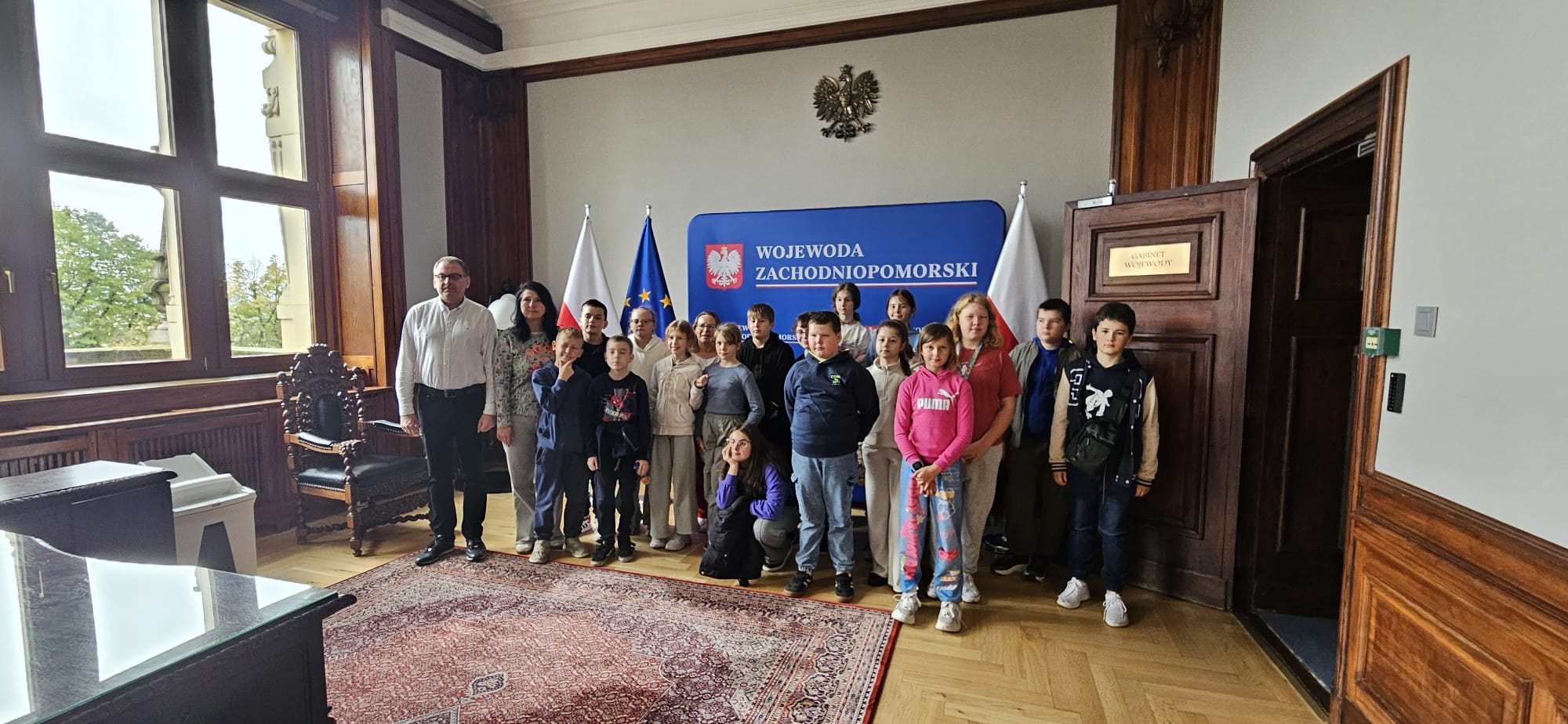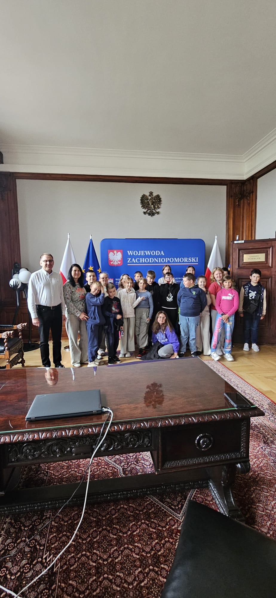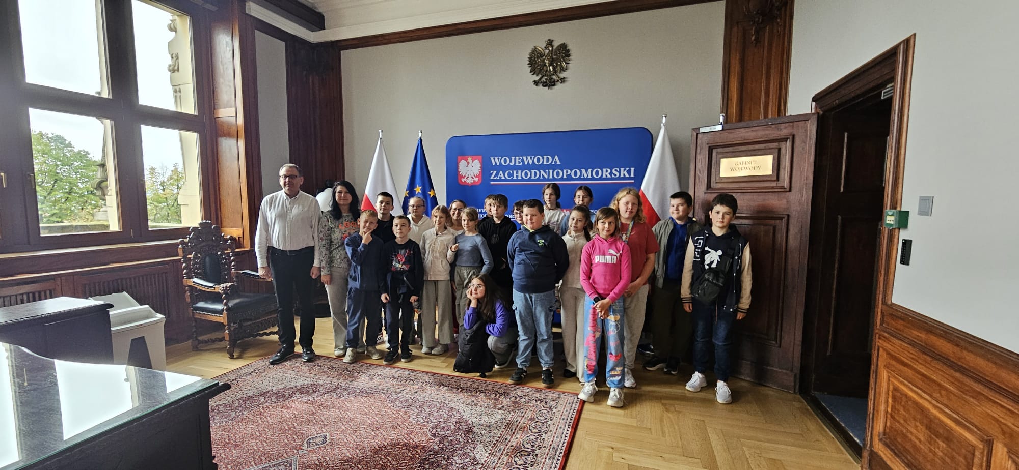 Dnia 18 września 2025 roku uczniowie klasy 5b wraz z nauczycielami wyszli na wycieczkę do Zachodniopomorskiego Urzędu Wojewódzkiego. Uczniowie dowiedzieli się bardzo wiele na temat budowy okazałego gmachu mieszczącego się na Wałach Chrobrego. Pani przewodniczka przybliżyła historię budynku i opowiedziała o tym jakie sprawy mogą w Urzędzie Wojewódzkim załatwić mieszkańcy miasta i województwa.Z okazałej wieży widokowej mogliśmy oglądnąć panoramę naszego pięknego Szczecina, a schodząc do podziemnej części zobaczyliśmy tajemnicze kanały biegnące być może pod korytem rzeki Odry. Spotkała nas też bardzo miła niespodzianka -gościł nas u siebie pan wicewojewoda Dawid Krystek, który opowiedział nam o swojej pracy oraz o pracy współpracowników oraz zaprosił nas na kolejną wizytę.