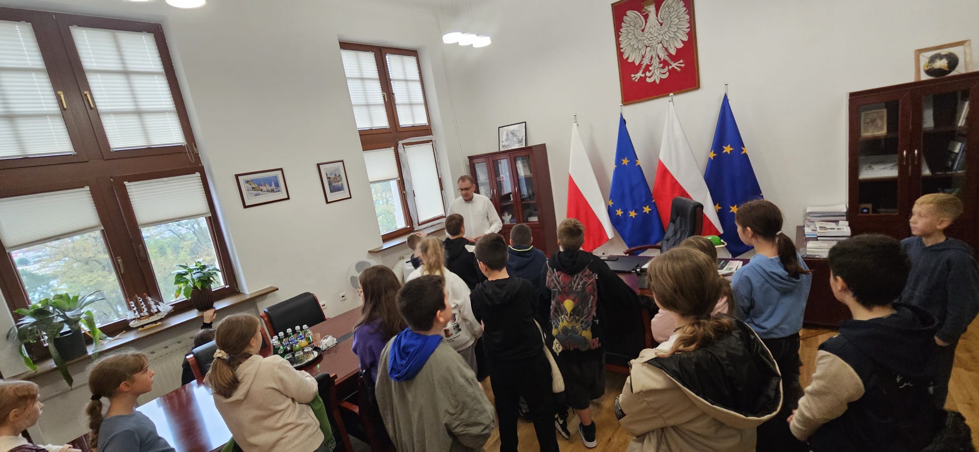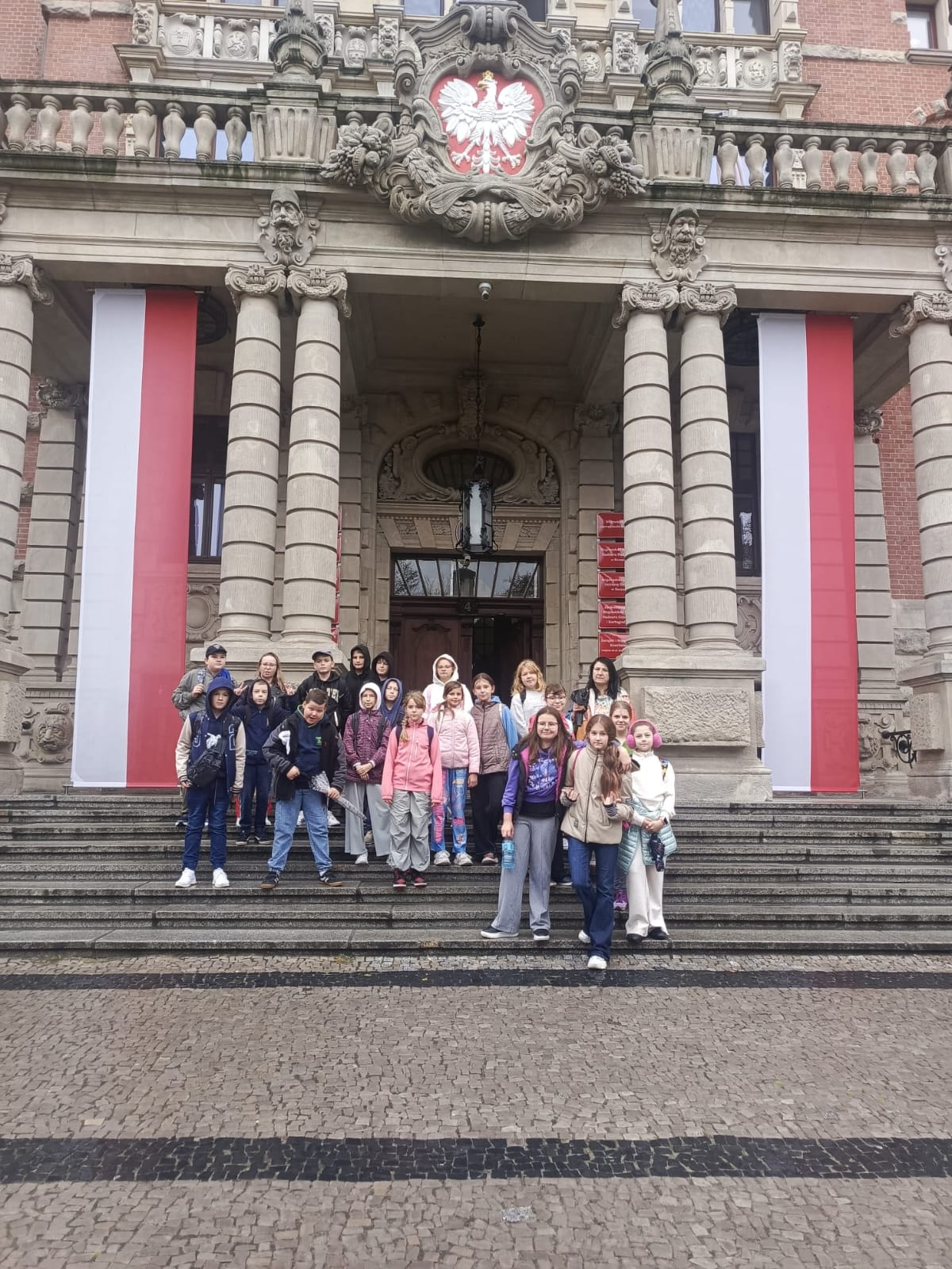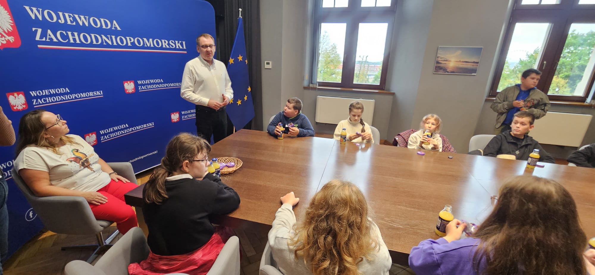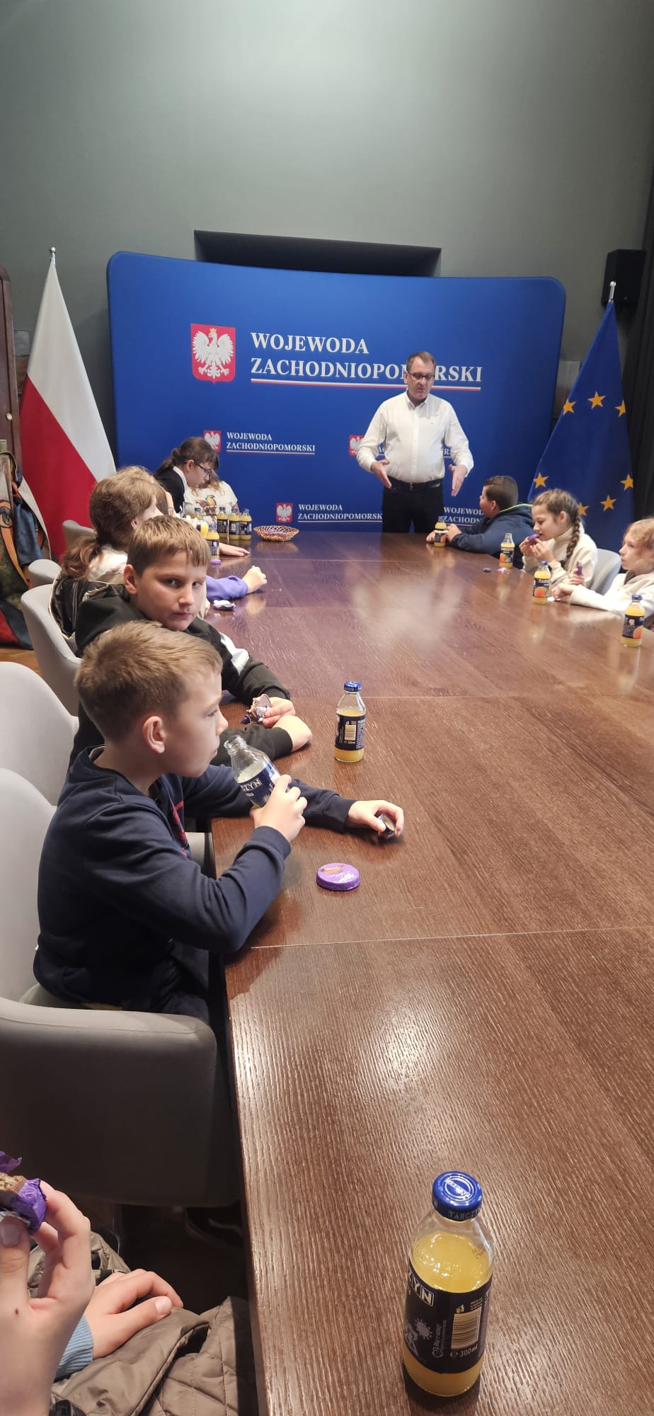 Dnia 18 września 2025 roku uczniowie klasy 5b wraz z nauczycielami wyszli na wycieczkę do Zachodniopomorskiego Urzędu Wojewódzkiego. Uczniowie dowiedzieli się bardzo wiele na temat budowy okazałego gmachu mieszczącego się na Wałach Chrobrego. Pani przewodniczka przybliżyła historię budynku i opowiedziała o tym jakie sprawy mogą w Urzędzie Wojewódzkim załatwić mieszkańcy miasta i województwa.Z okazałej wieży widokowej mogliśmy oglądnąć panoramę naszego pięknego Szczecina, a schodząc do podziemnej części zobaczyliśmy tajemnicze kanały biegnące być może pod korytem rzeki Odry. Spotkała nas też bardzo miła niespodzianka -gościł nas u siebie pan wicewojewoda Dawid Krystek, który opowiedział nam o swojej pracy oraz o pracy współpracowników oraz zaprosił nas na kolejną wizytę.
