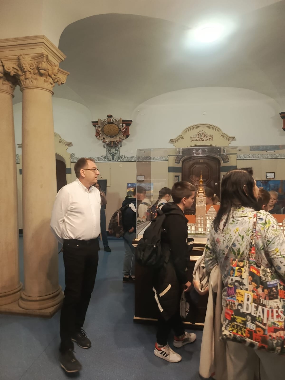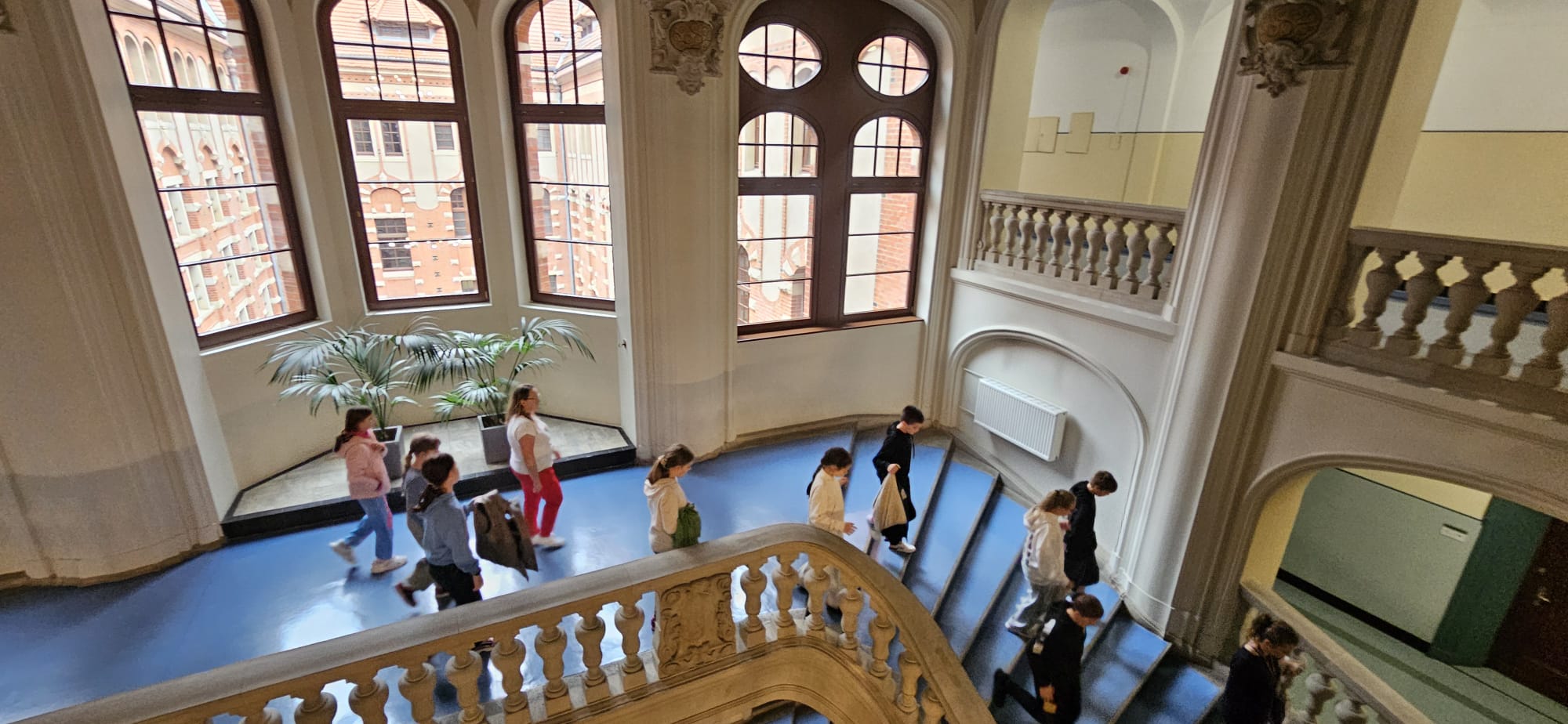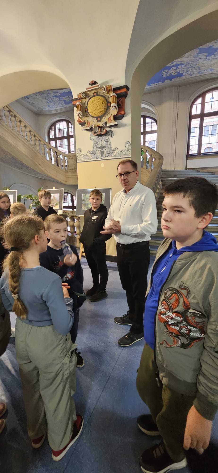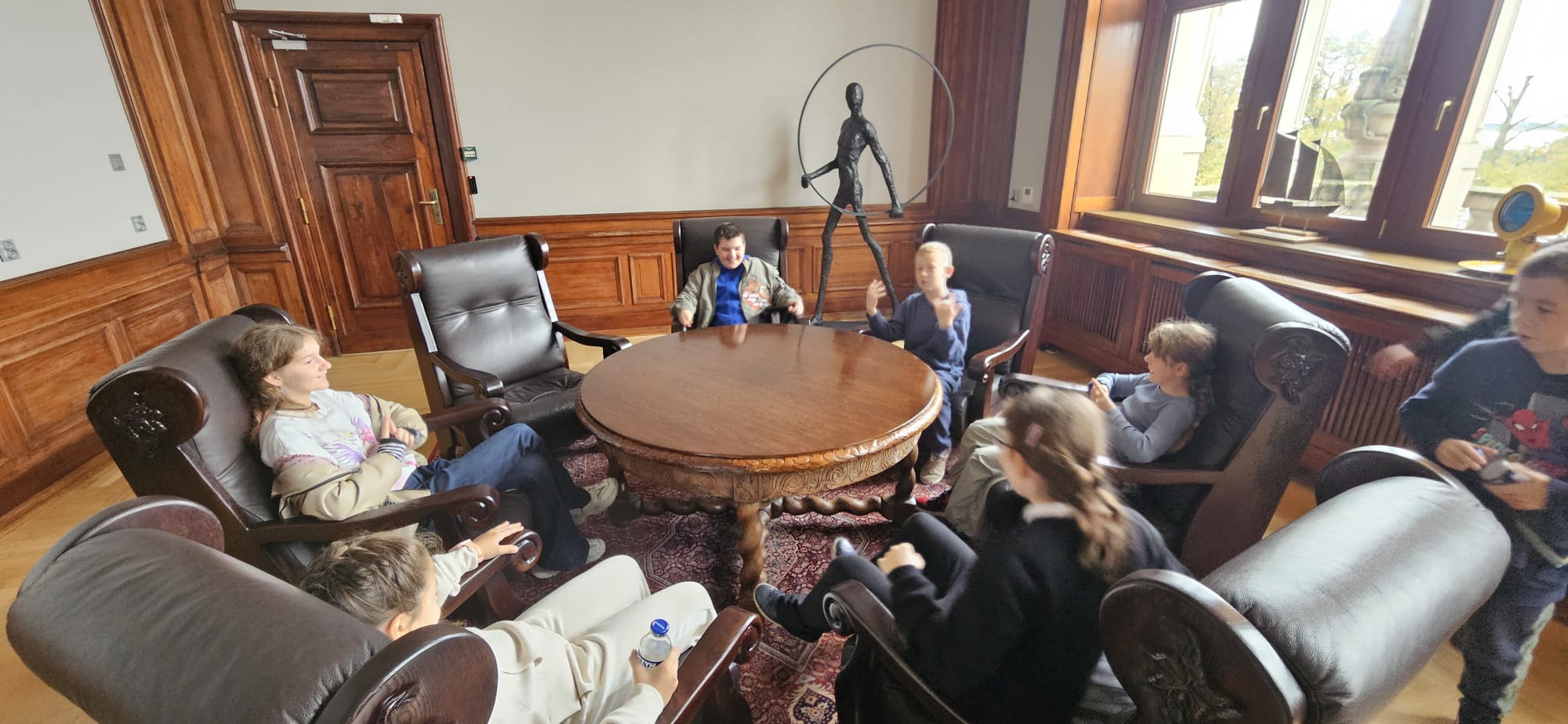 Dnia 18 września 2025 roku uczniowie klasy 5b wraz z nauczycielami wyszli na wycieczkę do Zachodniopomorskiego Urzędu Wojewódzkiego. Uczniowie dowiedzieli się bardzo wiele na temat budowy okazałego gmachu mieszczącego się na Wałach Chrobrego. Pani przewodniczka przybliżyła historię budynku i opowiedziała o tym jakie sprawy mogą w Urzędzie Wojewódzkim załatwić mieszkańcy miasta i województwa.Z okazałej wieży widokowej mogliśmy oglądnąć panoramę naszego pięknego Szczecina, a schodząc do podziemnej części zobaczyliśmy tajemnicze kanały biegnące być może pod korytem rzeki Odry. Spotkała nas też bardzo miła niespodzianka -gościł nas u siebie pan wicewojewoda Dawid Krystek, który opowiedział nam o swojej pracy oraz o pracy współpracowników oraz zaprosił nas na kolejną wizytę.
